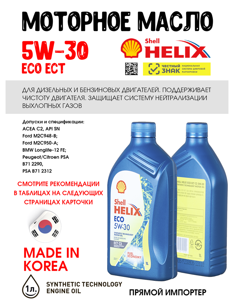 Shell Helix ECO (Engine Care & Optimization*) ECT С2 5W-30 – полностью синтетическое моторное масло, созданное для надежной работы бензиновых и дизельных двигателей. Помогает оптимизировать стоимость обслуживания автомобиля: защищает детали двигателя от износа, продлевая срок его службы, и сохраняет стабильные свойства смазочного материала на протяжении всего срока эксплуатации, вплоть до следующей замены**.